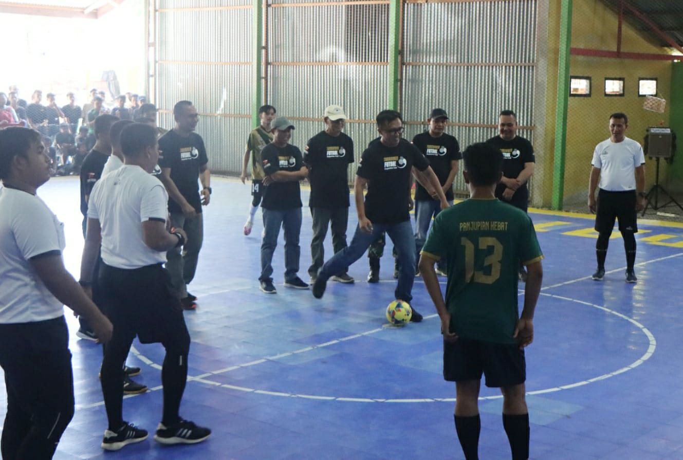 Kapolres Aceh Selatan AKBP Nova Suryandaru, S.IK menendang bola saat mebuka acara turnamen Futsal
