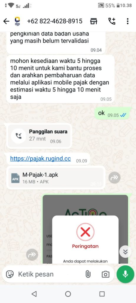 Tapaktuan, KBBAceh.news – Akhir-akhir ini semakin marak penipuan yang mengatasnamakan Dirjen Pajak melalui aplikasi pajak online palsu dan juga melalui link-link yang dikirim oleh si pelaku terhadap target atau korban.