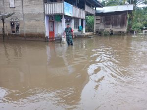 KBBAceh.News | Aceh Selatan – Kepedulian tanpa batas kembali ditunjukkan prajurit TNI. Babinsa Koramil 08/Bakongan hadir sebagai garda terdepan membantu warga Desa Beutong, Kecamatan Kota Bahagia, yang terdampak banjir pada siang hari, Selasa (18/11/2025).