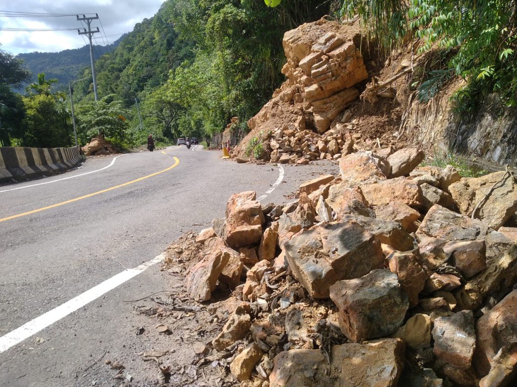 KBBAcehnews.com | ACEH SELATAN – Kondisi bekas longsoran batu yang masih menggantung di tebing sepanjang Jalan Nasional Tapaktuan–Medan tepatnya di jalan tanjakan Gampong Batu Itam Tapaktuan menuai kekhawatiran serius dari berbagai pihak. Ancaman tersebut dinilai sangat berbahaya bagi keselamatan pengguna jalan, terutama saat cuaca hujan yang berpotensi memicu longsor susulan.