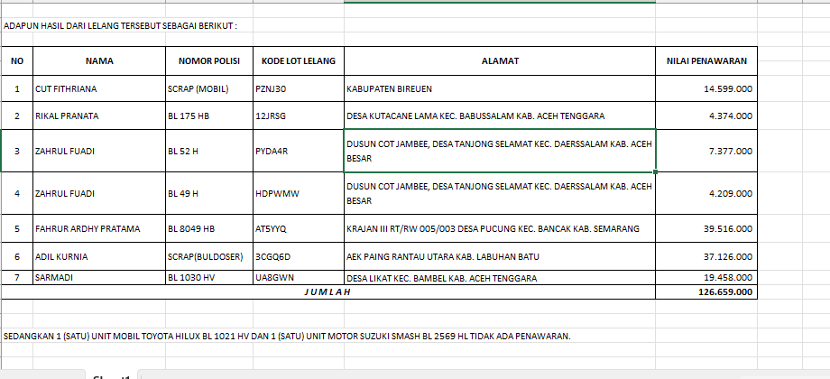 Kepala BPKAD Agara , Syukur Selamat Karo -Karo SE AK MM , melalui Kepala Bidang (Kabid) Aset, Bintang Terang SKD SE MM kepada kbbaceh.news mengatakan, bahwa lelang non eksekusi ini melalui perantaraan Kantor Pelayanan Kekayaan Negara dan Lelang (KPKNL) Lhokseumawe Provinsi Aceh.
