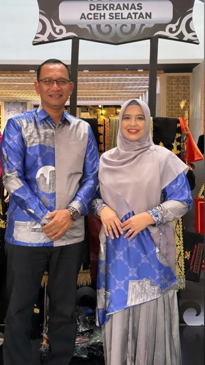 Disela pengunjung yang memadati stand Dekranasda Aceh Selatan, terlihat Kepala Dinas Pariwisata dan Kebudayaan Aceh, Almuniza Kamal, S.STP, serta mantan Bupati Pidie Jaya, H. Said Mulyadi, SE., M.Si. (red)