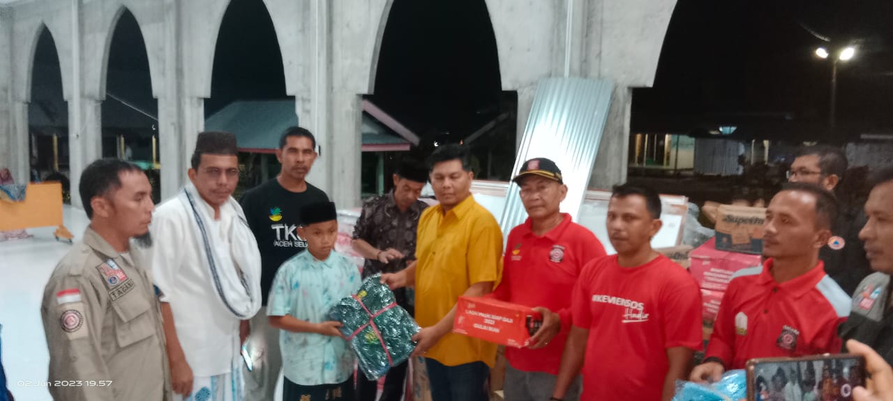 Tapaktuan,KBBAceh,news Kepala Dinas Sosial dan BPBD Aceh Selatan melalui Sekretaris Dinas Sosial Ismardi, SE dan Kabid Linjamsos menyerahkan Bantuan masa panik Korban Bencana Kebakaran di pesantren Nur Yaqdhah Gampong Kuta Traeng Kecamatan Labuhanhaji Barat, Jumat 02/06/2023.