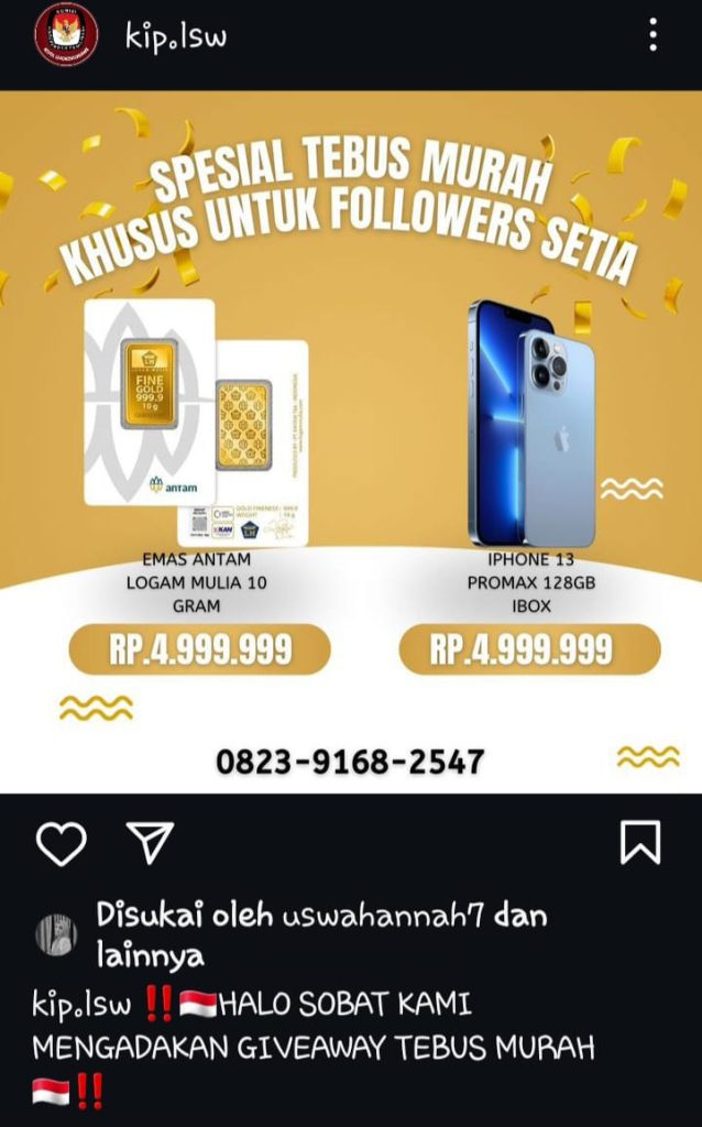 Penelusuran media ini, dilihat dilaman media sosial Instagram dengan user akun @Kip.lsw dalam postingan nya melaksanakan give way tebus murah 2 keping emas dan Iphone 13 Promax 128 GB Ibox untuk 2 orang tercepat dengan harga 4.999.999,-.