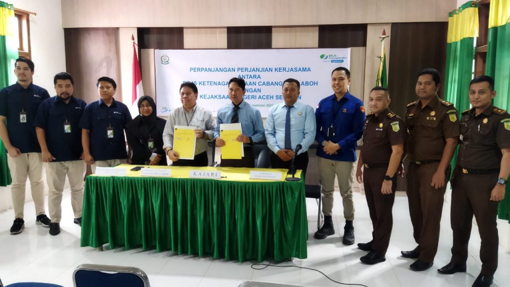 Tapaktuan, KBBACEH.news – Kejaksaan Negeri (Kejari) Aceh Selatan dan BPJS Ketenagakerjaan Meulaboh melaksanakan penandatanganan perpanjangan nota kesepakatan atau Morandum of Understanding (MoU), berlangsung di Aula Kantor Kejari, Jalan Nyak Adam Kamil Tapaktuan, Selasa (20/12/2022).