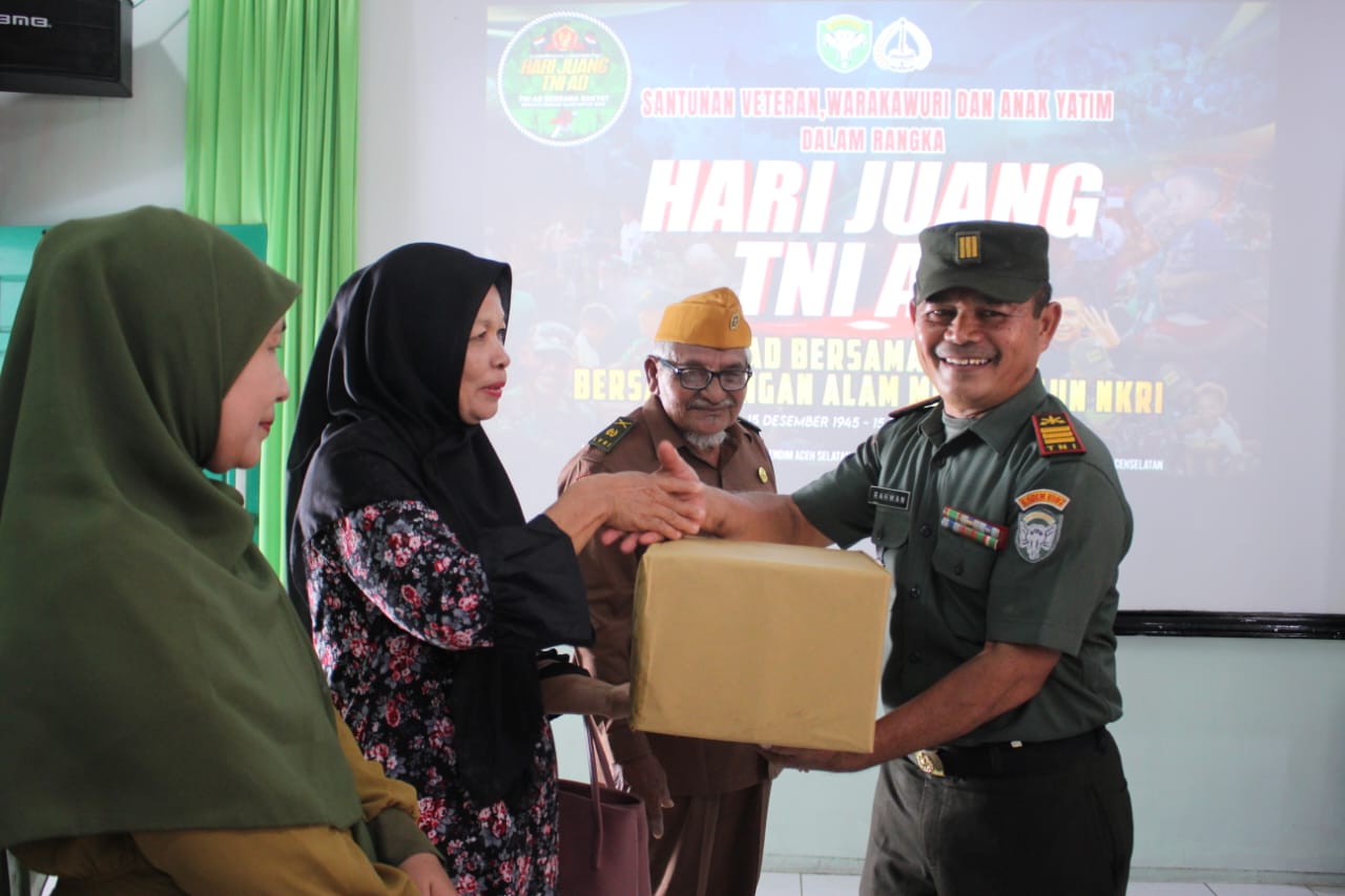 ACEH SELATAN, KBBAceh.news – Dalam rangka menyambut Hari Juang TNI AD ke 78 Tahun 2023, Kodim 0107/Aceh Selatan menggelar bhakti sosial penyantunan Veteran, Warakauri dan Anak Yatim yang dilaksanakan di Ruang Data Makodim setempat Desa Lhok Bengkuang Timur Kecamatan Tapaktuan, Rabu (13/12/2023).