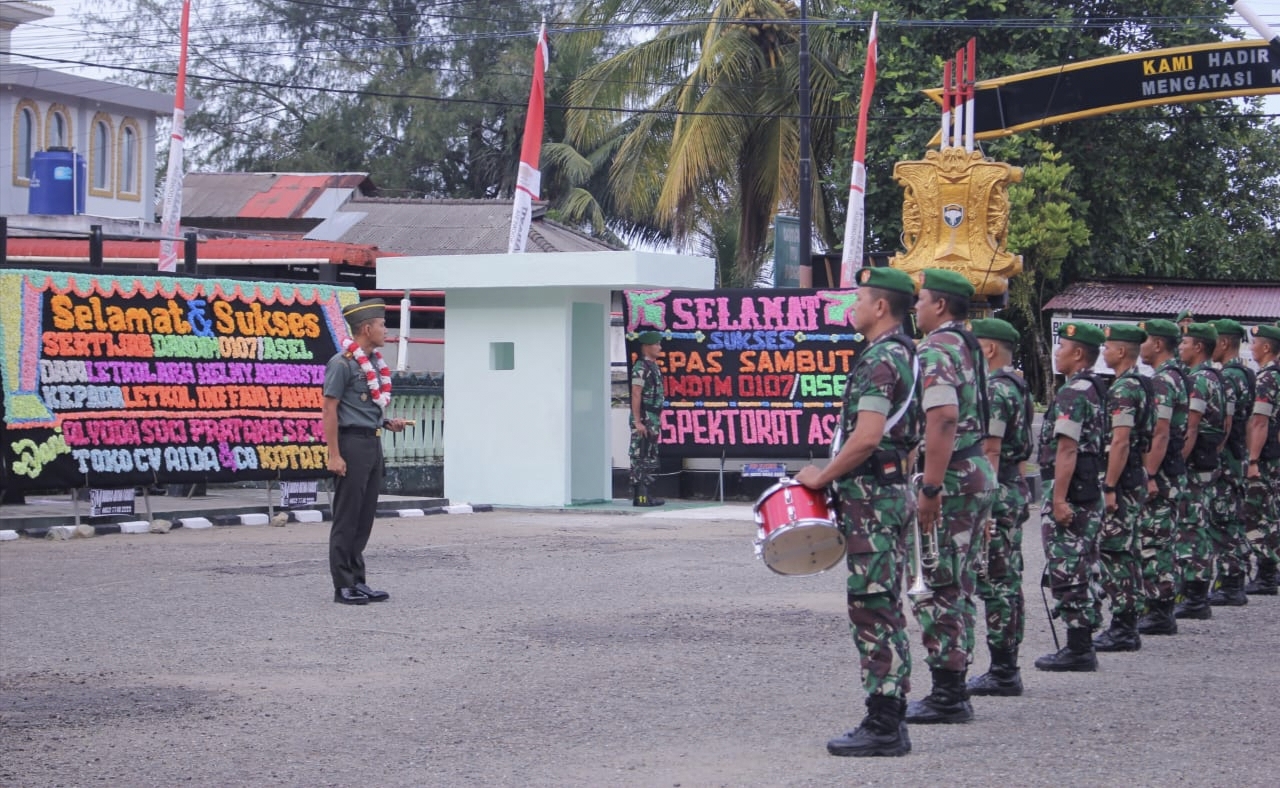 Tapaktuan.KBBAceh – Kodim 0107 Aceh Selatan menggelar tradisi satuan penerimaan warga baru yakni Komandan Kodim Letkol Inf Faiq Fahmi dan Ketua Persit KCK Cabang XXIX Kodim 0107 Ny. Dian Faiq Fahmi di Makodim Jl. T. Cut Ali, Desa Lhok Bengkung Timur, Kecamatan Tapaktuan, Kabupaten Aceh Selatan, Pada Kamis (27/7/2023).
