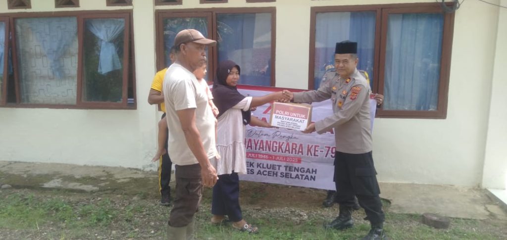 KBBAceh.News | Tapaktuan – Menyambut Hari Bhayangkara ke-79 tahun 2025, Polsek Kluet Tengah Polres Aceh Selatan Polda Aceh melaksanakan kegiatan penyaluran Bantuan Sosial (Bansos) kepada masyarakat kurang mampu di beberapa gampong dalam wilayah Kecamatan Kluet Utara, Kabupaten Aceh Selatan, Jumat, 27 Juni 2025.