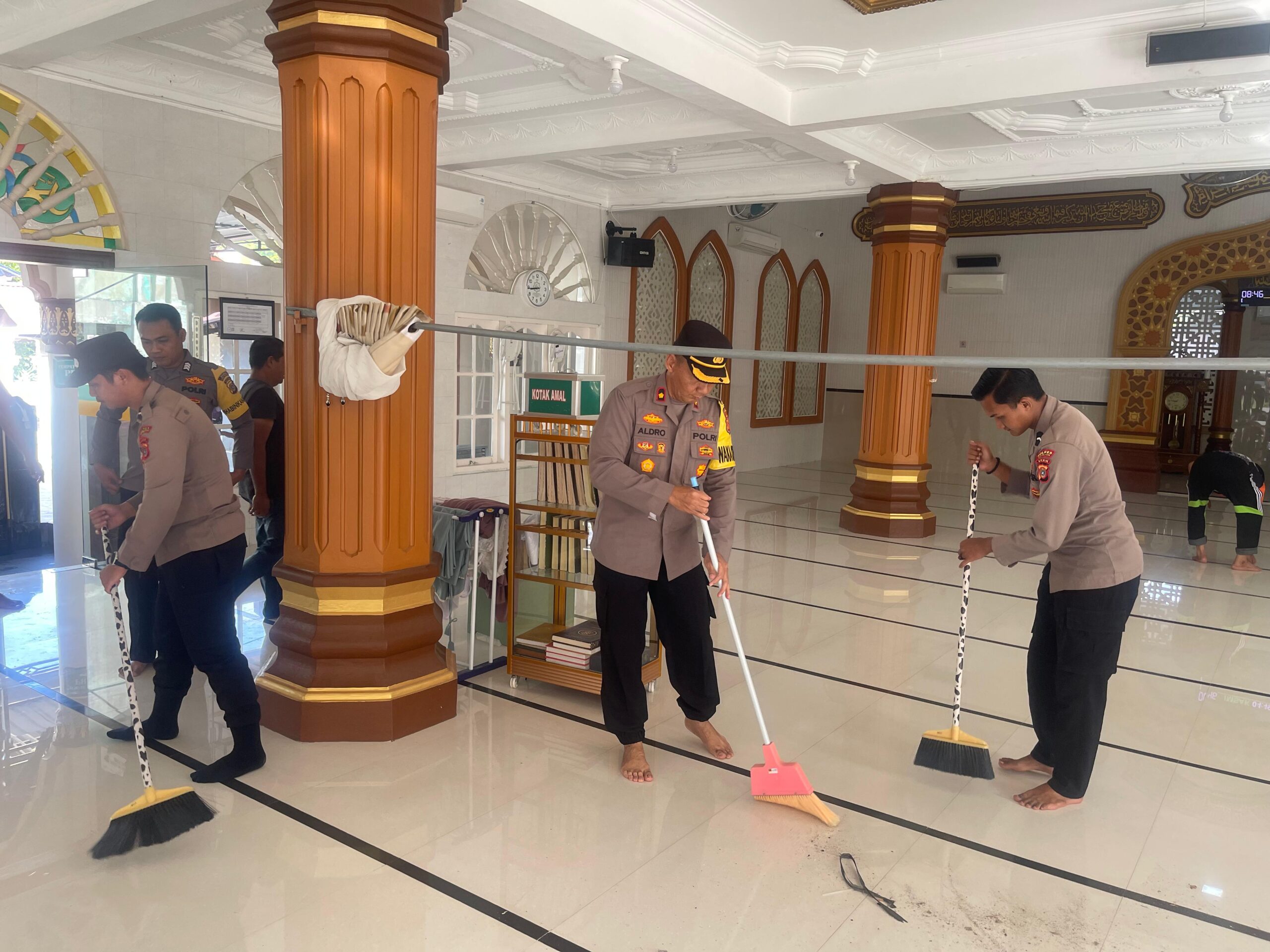 Kegiatan diawali dengan penyerahan peralatan kebersihan oleh Kapolres dan Wakapolres, kemudian dilanjutkan dengan membersihkan bagian dalam masjid dan pekarangan luar masjid.