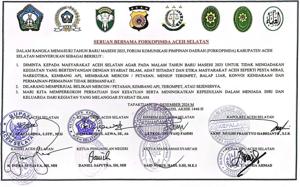 Tapaktuan, KBBAceh.news – Seruan forkopimda plus kabupaten Aceh Selatan pada masyarakat agar tidak melakukan kegiatan yang bertentangan dengan syariat islam di malam tahun baru bersifat baik dan mendidik (amal makruf nahi mungkar) akan tetapi andaikan seruan itu hanya berlaku untuk masyarakat saja maka himbau itu akan menjadi buruk dan omong kosong belaka (munafik) sementara pejabatnya sendiri berada di luar kota maka masyarakat dapat saja menduga bahwa sebahagian penjabat tersebut yang keluar daerah menyongsong malam tahun baru mereka turut serta merayakan tahun baru itu di luar daerah bersama keluarga, atau bersama keluarga baru pendamping mereka untuk berhura-hura berpestapora