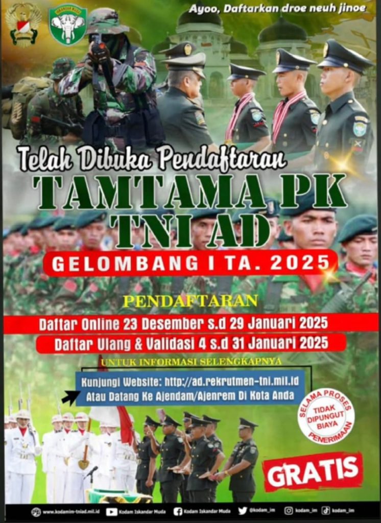 “Untuk informasi lebih lanjut bisa dibuka melalui website http://.ad.rekrutmen-tni-mil-id atau bisa kunjungi langsung kantor Kodim 0107/Aceh Selatan dan Koramil terdekat. Ini gratis, tidak dipungut biaya”, tegas Kapten Amri Umari. (Red)