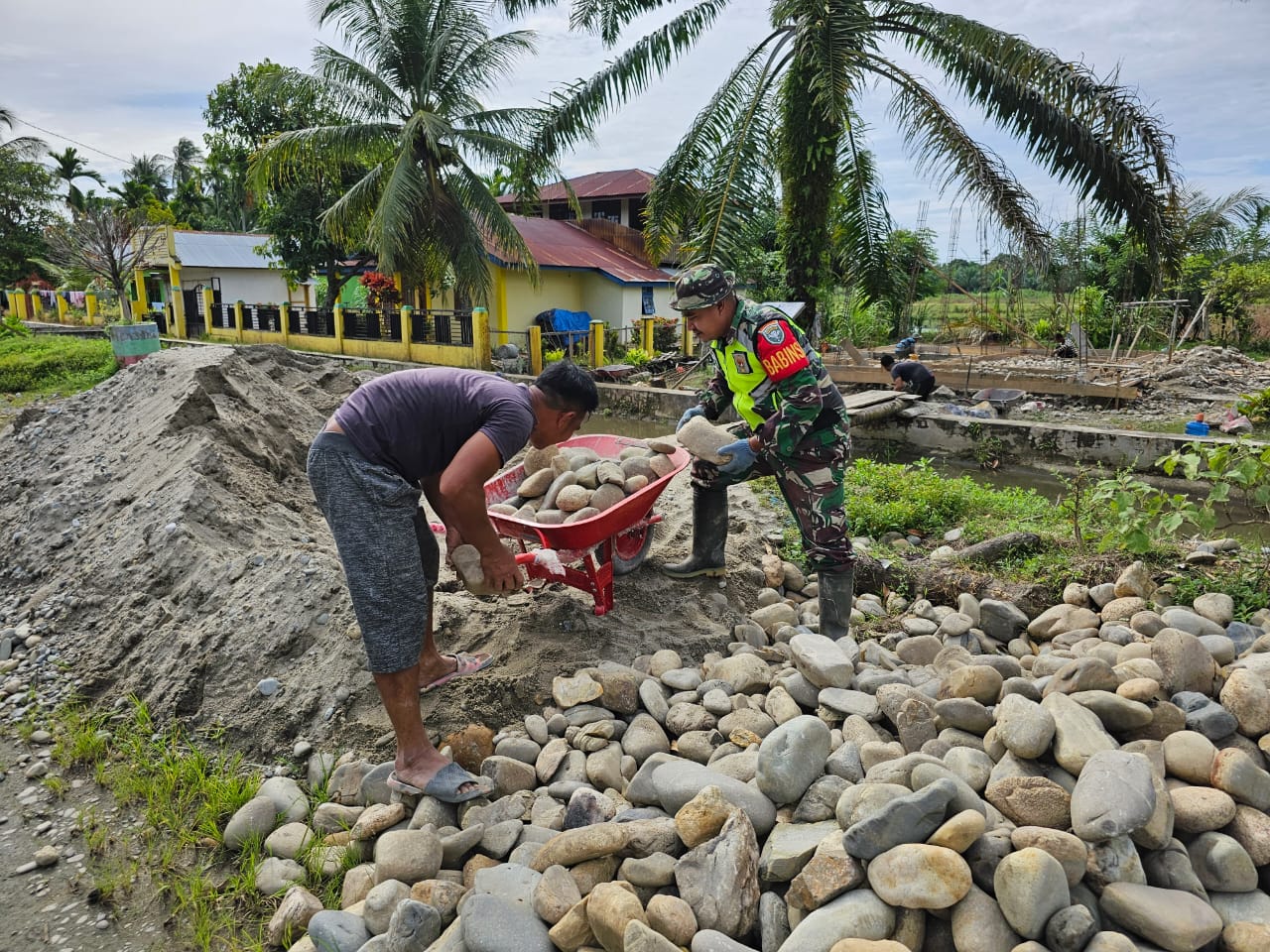Babinsa Serda Zainal Amri menyempatkan membantu warga desa binaanya yang sedang mambangun rumah yang bertempat di Desa Paya Dapur Kecamatan Kluet Timur, Minggu 24/9/2023).