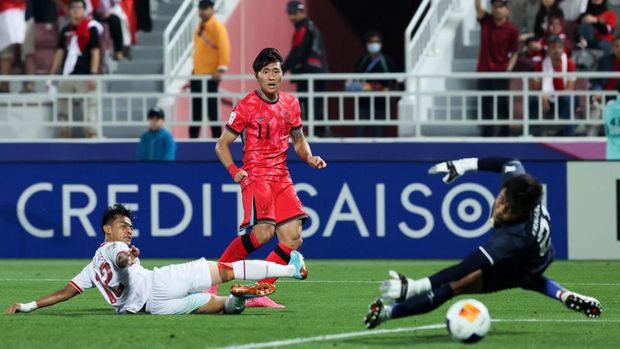 Korea Selatan vs Indonesia pada perempatfinal Piala Asia U-23 2024 berlangsung di Stadion Abdullah bin Khalifa, Doha Qatar, Jumat (26/4). Tim Garuda bisa unggul lebih dulu lewat Rafael Struick di menit ke-15. Korsel bisa menyetarakan angka akibat bunuh diri Komang Teguh menit ke-45+1. Sebelum jeda, Indonesia bisa kembali memimpin usai Struick bikin brace di menit ke-45+5.